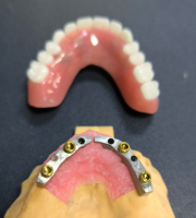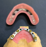 Restauro CADCAM dell'arcata completa del laboratorio odontotecnico WM China Ibar in titanio posizionato con Locator e protesi rimovibile